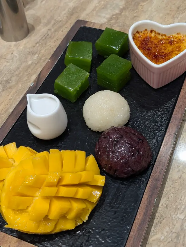 甜品拼盤有齊芒果糯米飯、椰汁糕同焦糖布甸,芒果非常香甜,糯米飯軟糯,焦糖布甸蛋香濃郁,為晚餐畫上完美句號。