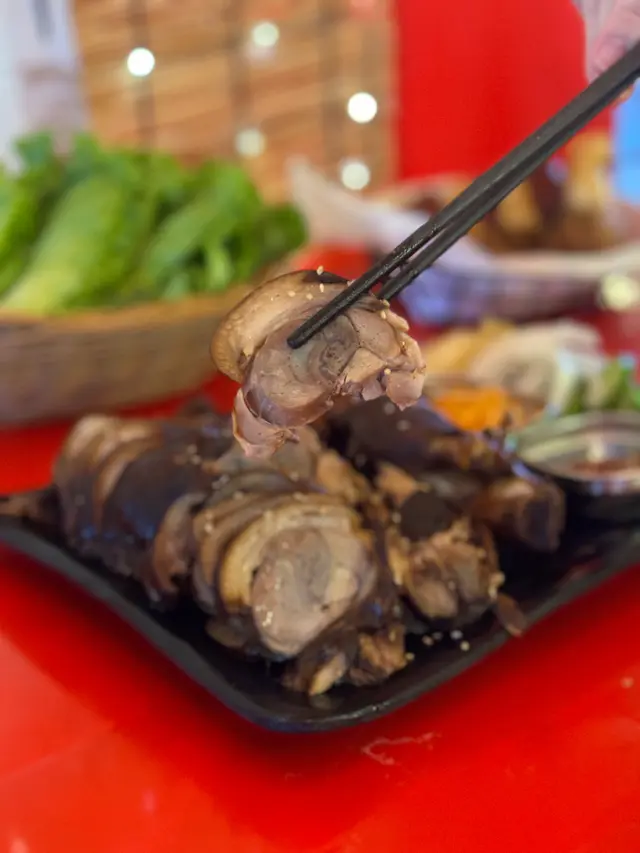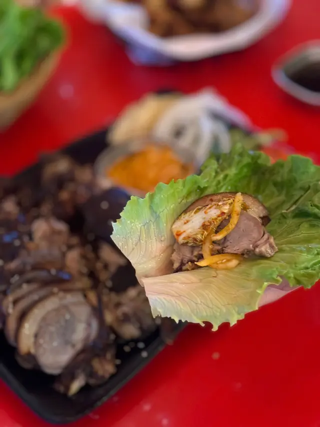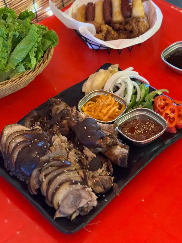 韓國其中一樣出名嘅菜式就係豬腳,今次都叫咗一份豬腳嚟試下,豬腳已經幫手拆骨切片, 另外仲有生菜、醃蘿蔔、大醬、青陽辣椒、洋蔥等配料,可以夾埋豬腳一齊食,豬腳口感軟淋,煮得入味