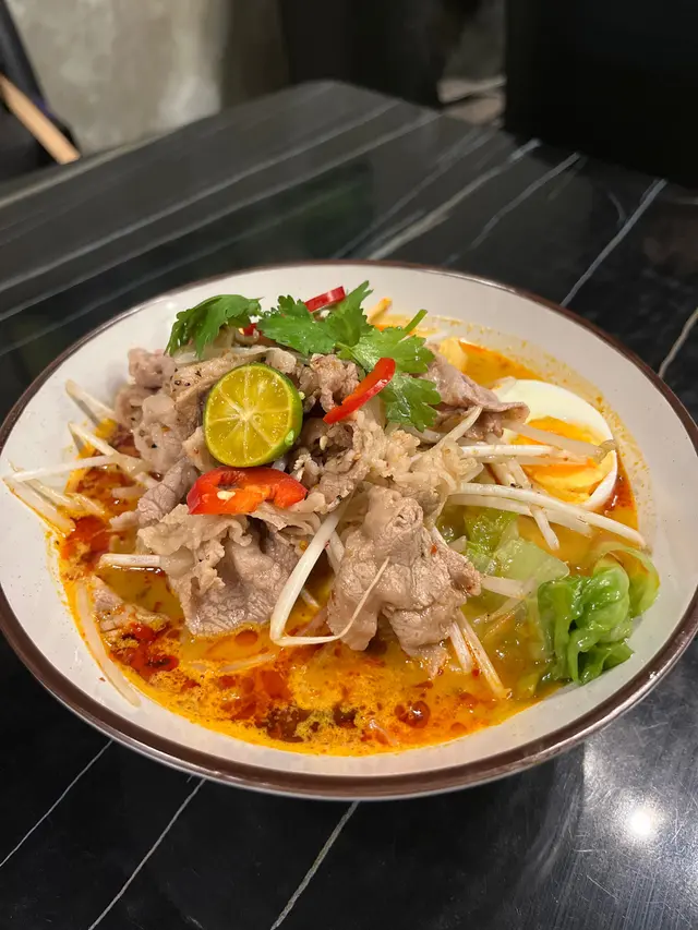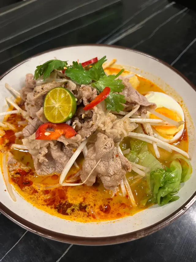 叻沙湯麵咖喱味濃烈,湯底香滑,肥牛鮮嫩與香料搭配恰到好處。麵條吸附湯汁,口感豐富。