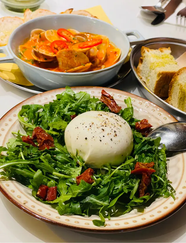 非常新鮮嘅沙律火箭菜,配上原個布拉塔芝士和醃漬蕃茄乾,只需添加少少黑椒碎,味道已經非常突出,整個沙律清新又開胃,特別是蕃茄乾遇上芝士,非常傳統嘅意大利風味😋