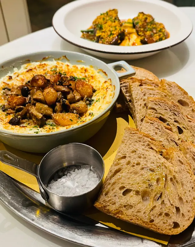 這道菜是我第一次食,揀佢嘅原因係我鍾意食芝士和酸種包,用熱辣辣的鐵盤盛載住原個溶化咗既芝士,再鋪上充滿蒜香味既炒蘑菇、原粒蒜頭,伴上充滿橄欖油香嘅酸種包一齊食,再飲一啖白酒,真係好味得難以形容,好喜歡這個菜式