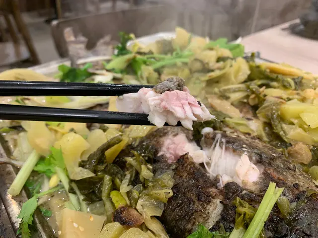 酸菜味湯底唔辣,但隨個人喜好可加辣。酸菜份量多到鋪滿成條魚,酸菜醃到好夠味,酸鹹。仲有芽菜、洋蔥得炒香成湯料。