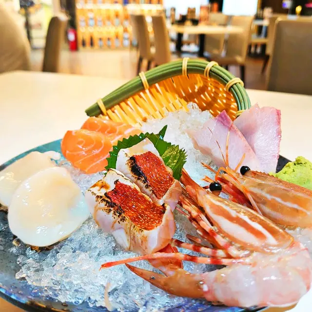 另外隨餐選了五點刺身拼盤,金目鯛、牡丹蝦、三文魚、油甘魚