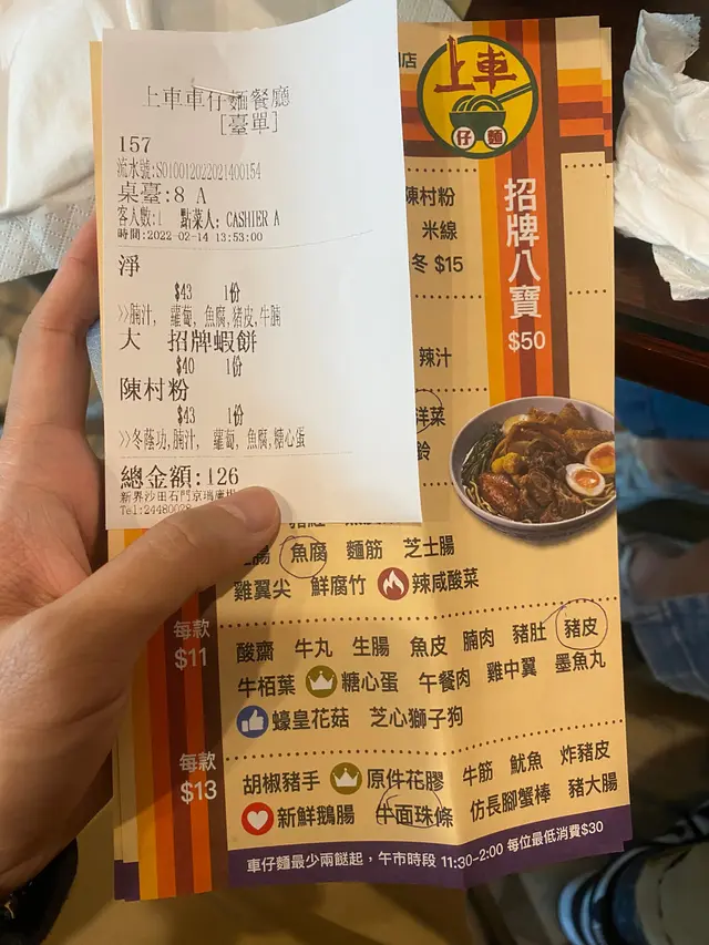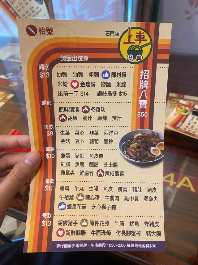 呢度最低消費$30,麵底$13,分別有$9、$10、$11、$13嘅餸,有6款湯底同10款麵底,比較特別嘅湯底有胡椒豬肚湯、冬陰功湯,而比較特別嘅餸有牛面珠條、原件花膠、新鮮鵝腸、仿長腳蟹棒、辣鹹酸菜等。如果有選擇困難症嘅人可以試吓招牌八寶,另外一頁有其他飯類同小食,由$30到$40幾蚊不等。