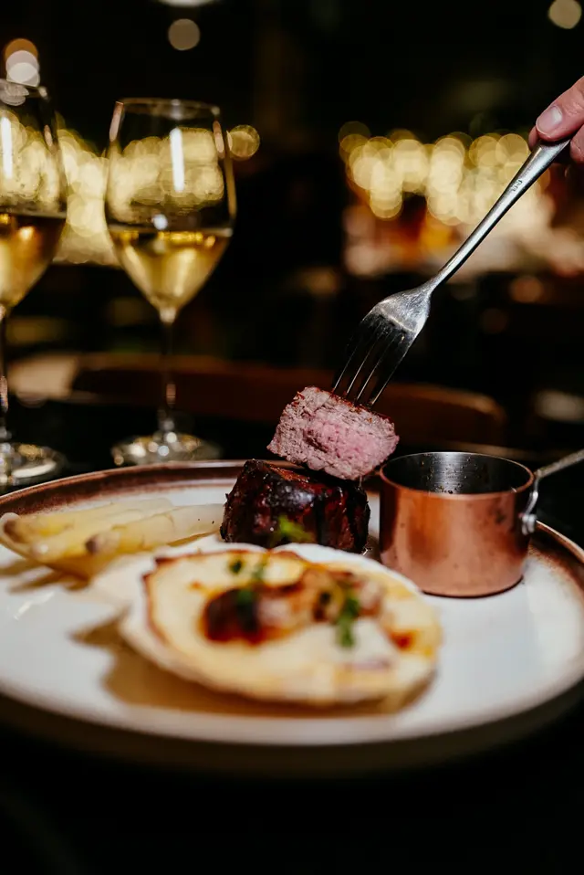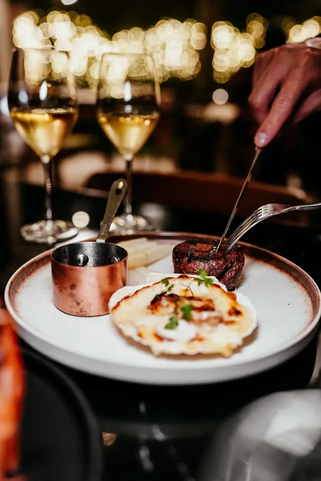 ✦ 安格斯牛柳配黑胡椒汁伴蟹肉芝士焗元貝配烤新鮮白蘆筍