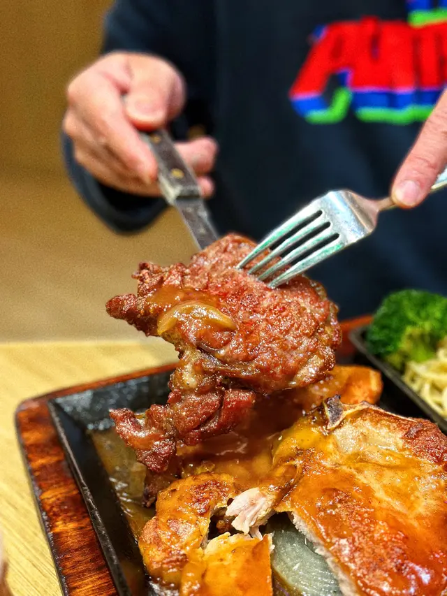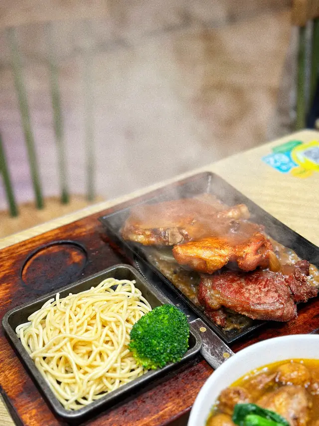 三塊扒分別係厚切豬扒(4oz)、雞扒(6oz)、頂級西冷扒🥩(5oz),鐵板好夠熱,食到尾都keep到溫度🌡️。