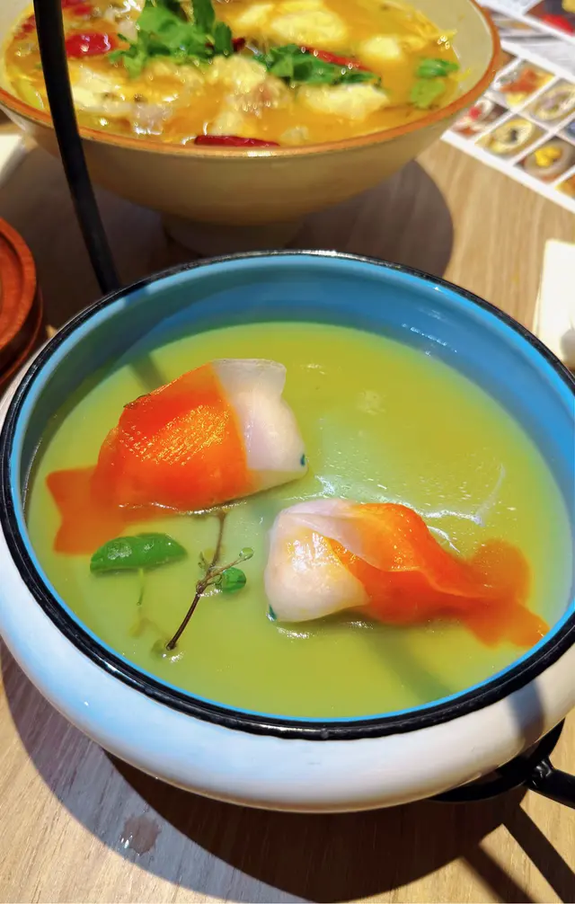 半透明皮裹著粉色蝦餡,捏成金魚形浮在清湯裡。蝦餃皮滑嫩Q彈,蝦餡鮮甜飽滿,湯底清鮮帶點薑香,是「好看又好吃」的代表作