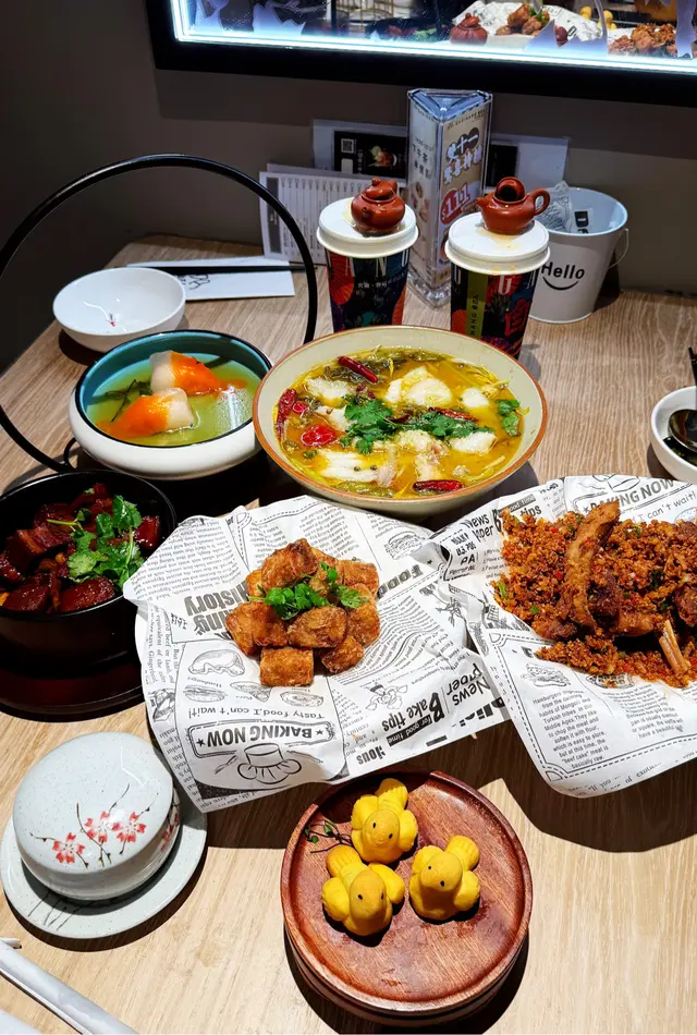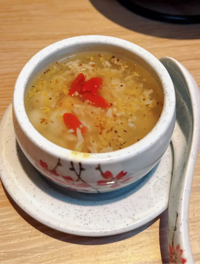 金黃小丸子泡在淺黃湯裡,撒了桂花碎。丸子外軟內糯,酒釅香氣淡淡的不沖鼻,甜而不膩,當收尾甜湯剛剛好