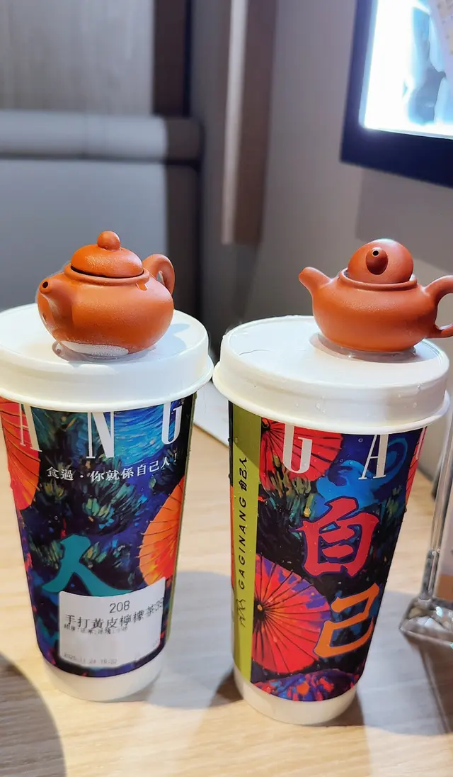 茶飲杯蓋上居然有個迷你小茶壺,還慢悠悠冒著細碎白煙,像把茶館的煙火氣縮進了杯子裡!