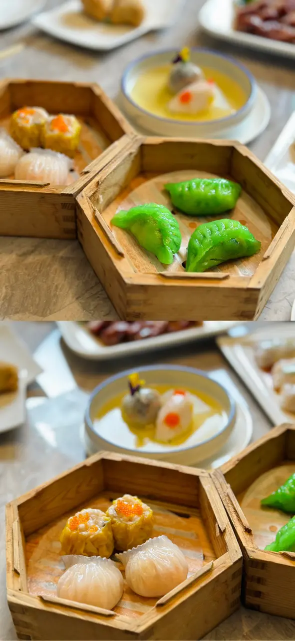超可愛的擺碟!蝦餃用了可愛的金魚造型,大人小朋友的覺得這樣子很趣緻。水晶球是素菜餃,多汁清甜~放在上湯碟上,就如金魚在池塘暢泳