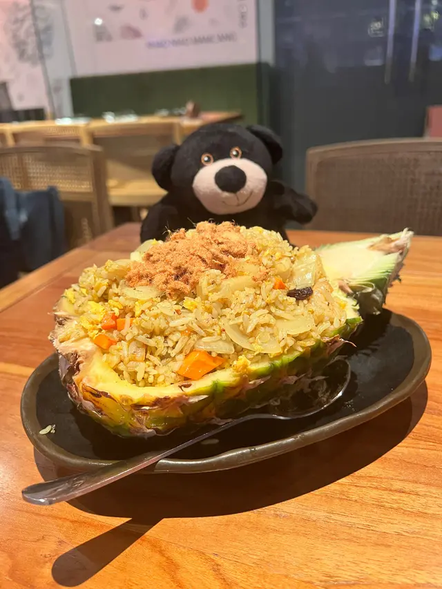 用菠蘿殼裝了菠蘿炒飯,內裏嘅材料非常豐富,有魷魚、蝦、提子、肉鬆、菠蘿等等,味道適中,而且炒飯炒到粒粒分明。