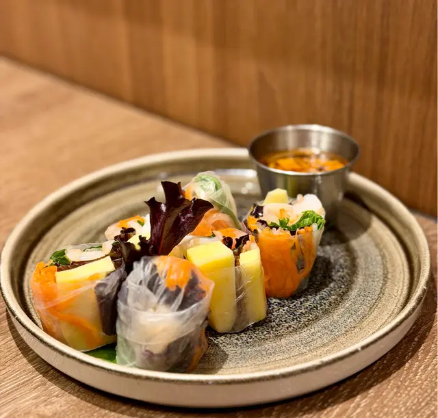 米紙晶瑩剔透 包裹著爽甜蝦肉、鮮甜芒果🥭、蘿蔔絲、雞蛋🥚配料 蘸上酸甜醬汁 清爽開胃🤤