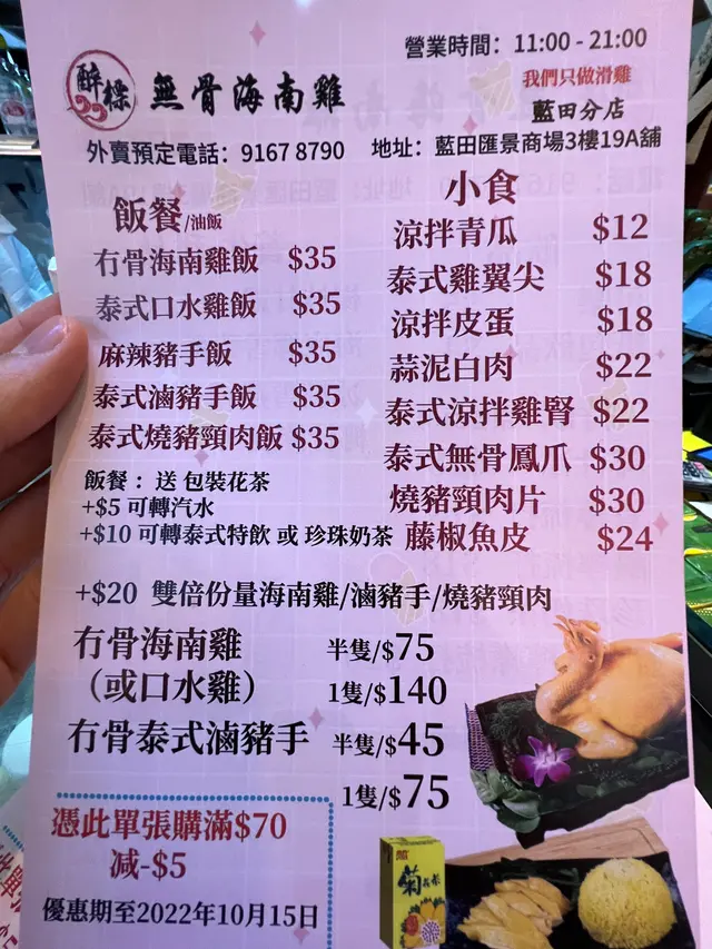 泰式無骨海南雞 外賣抵食之選 🐔 foodiehkboy等級42022-10-20256 瀏覽 關注 $32一盒既外賣海南雞真係超級抵💰市區雙送飯講真都唔止呢個價錢🤪 呢個飯盒絕對高質 今次仲試埋佢既小食同甜品😚 款式不少食完真係大滿足❤️⭐️ 無骨海南雞飯 🐔無骨啖啖肉真係好正👍🏻 雞肉唔肥仲要好嫩滑🤤醬汁另上帶點蒜香既辣味🧄 油飯香味十足🍚⭐️ 泰式口水雞飯 🇹🇭口水雞調味帶點麻辣的香🌶 醬汁送飯一流 比較惹味但唔會太過重口味💕⭐️ 蒜泥白肉 🥓調味啱啱恰到好處蒜味十足🥴 白肉又唔會太肥🥳⭐️ 涼伴皮蛋 🍳皮蛋帶少少流心感覺質素很不錯🤩⭐️ 楊枝甘露 🥭有芒果同埋西米飲落好足料🧋 份量仲要好足夠消暑☀️ 唯獨甜度可以輕手DD⭐️ 海底椰雪梨膏 🍐雪梨膏飲落好清甜 甜度唔會太高🌱 果凍咁既口感好得意🍮1以上食評乃用戶個人意見 , 並不代表OpenRice之觀點。讚好分享泰式無骨海南雞 外賣抵食之選 🐔 醉標無骨海南雞 (匯景商場) https://s.openrice.com/QrbT05zYYW0檢舉 張貼 評分5味道4環境5服務5衛生5抵食用餐途徑外賣自取