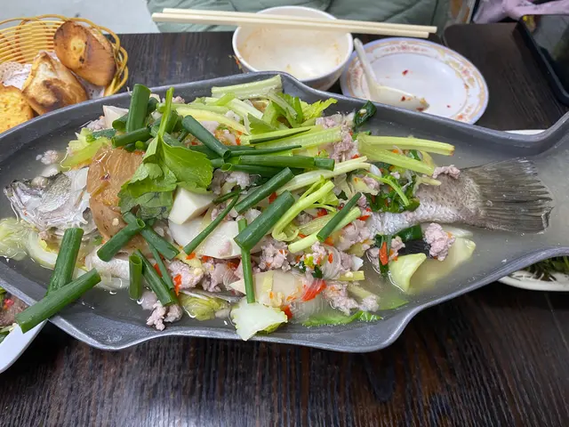 呢個時候,剛剛好馬拉盞炒通菜同泰式明爐魚一齊上,好正好正!通菜上菜時已經係陣陣鹹香,菜炒得翠綠亦冇“水汪汪”,相當鮮嫩可口,廚房師傅應記一功!喜歡呢度嘅明爐魚有不同的魚類選擇,當中竟然有盲曹,相對烏頭更滑又少啲骨,咁當然唔使諗其他啦!咁幼滑嘅魚,浸湯明爐上會唔會浪費咗?答案係完全唔會,因為泰式湯底令魚肉保持幼滑之餘,亦加多一份鮮甜!少少辣椒粒,蒜片,酸梅,洋蔥,加配不少肉碎和葱條伴著魚吃,係層次豐富的口感,一啖一啖慢慢食,係一個很享受食嘅過程!