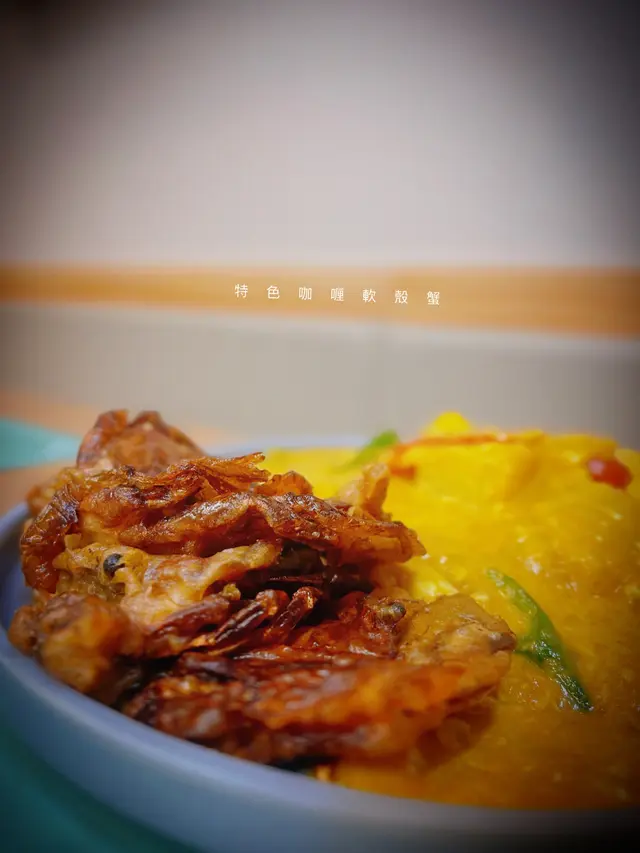在軟殼蟹外面掛上一層黃咖喱汁就更為惹味