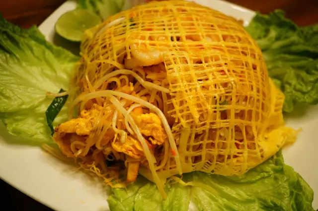 澱粉質女孩怎能錯過這裡的Pad Thai?!十多款飯、麵,應有盡有,金邊粉也分乾和濕兩種。炒金邊粉賣相精緻,薄薄的煎蛋皮呈網狀,緊緊包裹著金邊粉,真不想弄破它啊!我小心翼翼地戳穿蛋皮,發現蝦仁、芽菜、豆腐乾和蛋絲等配料,吃時把一旁的花生碎、砂糖加在金邊粉上,再擠點青檸汁,酸酸甜甜,真的很好吃!