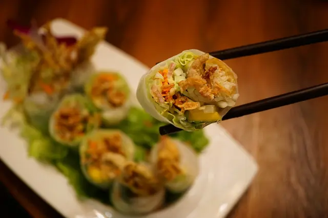 一向喜歡吃越式米紙卷,這軟殼蟹卷餡料特別豐富!薄而滑溜的米紙帶點韌度,夾起時不易穿,包裹著芒果、軟殼蟹、牛油果,加上洋蔥、蘿蔔等蔬菜增加爽脆口感,清爽不膩。軟殼蟹炸得十分香脆,亦不油膩,跟甜美芒果一向是最佳拍檔。