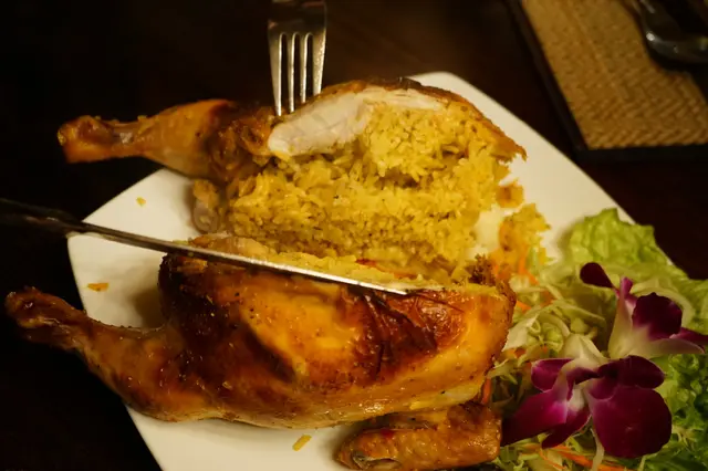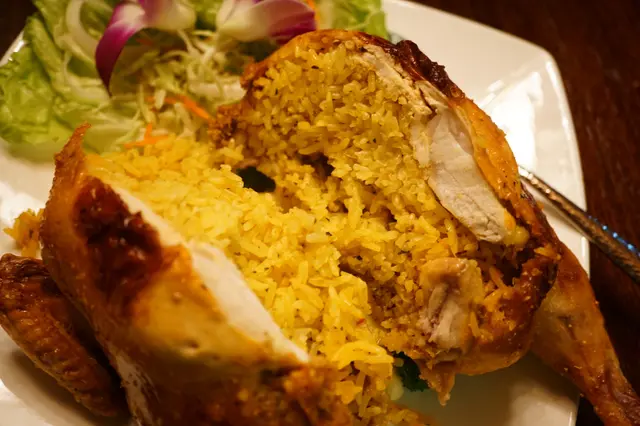 雞身色澤亮麗,咬下薄脆,大廚還貼心地去除了大部份骨頭,方便客人進食。雞的中間釀入香茅黃薑飯再拿去焗,春雞焗過後肉質仍然保持鮮嫩,飯亦吸收了春雞的精華,充滿油香。