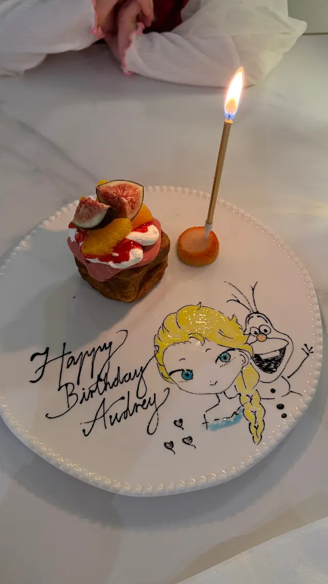 咁靚嘅餐桌佈置,又有甜品畫碟,仲要係女女最鍾意嘅Elsa、Olaf🩵🤍,佢超開心❤加入3種唔同甜度嘅水果,口感清新,牛角酥整成骰子形狀,好得意呀!