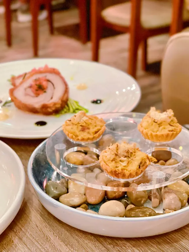撻皮酥脆,上面放滿鮮甜的蟹肉絲,加上花椒、青檸、芝士,精緻又美味。