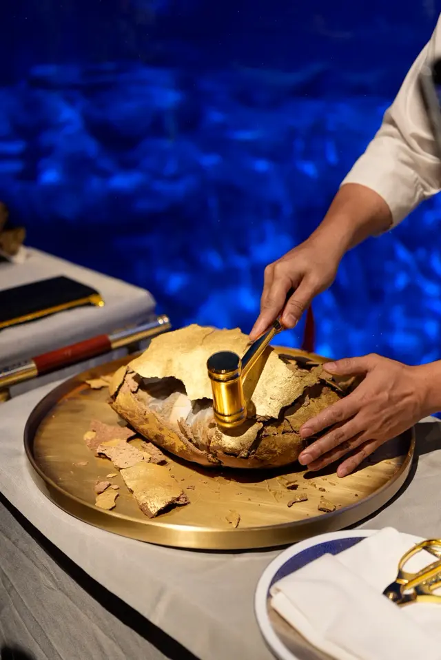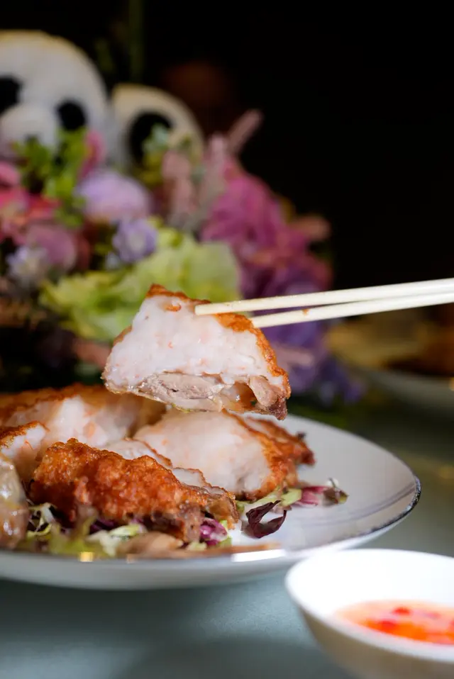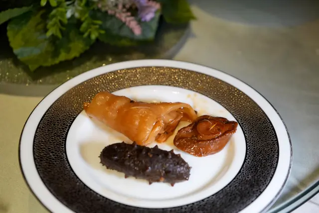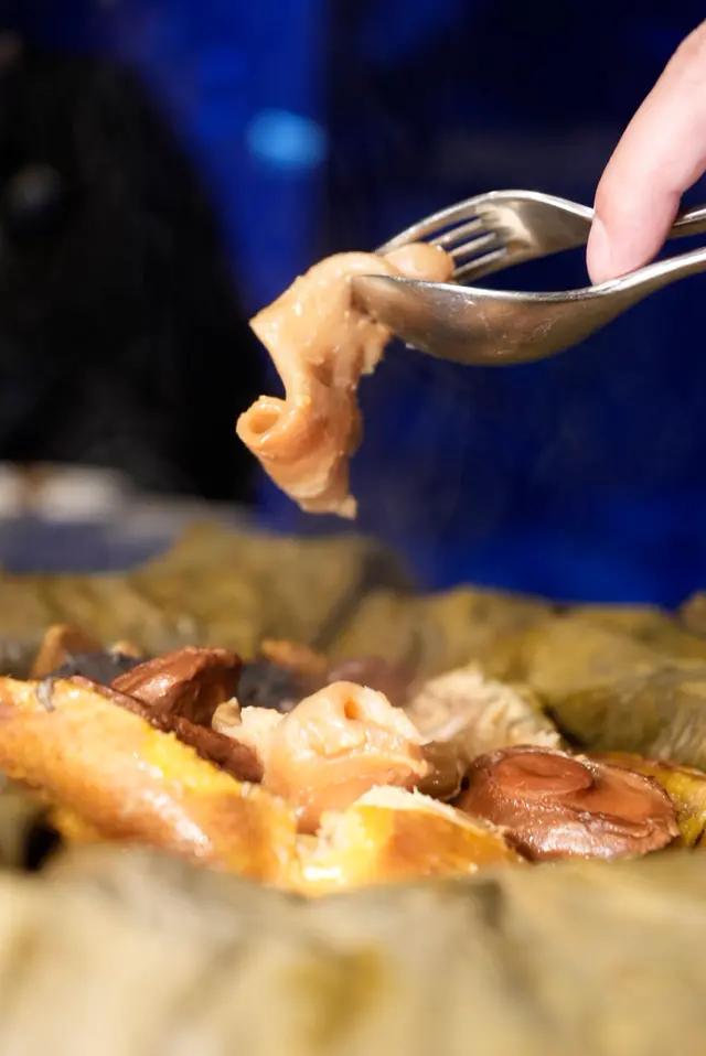 又名叫化雞,選用肥嫩三黃雞,泥封烤焗3小時,敲開瞬間荷香四溢,腹藏鮑魚、海參、花膠、冬菇等,雞肉入口即化。