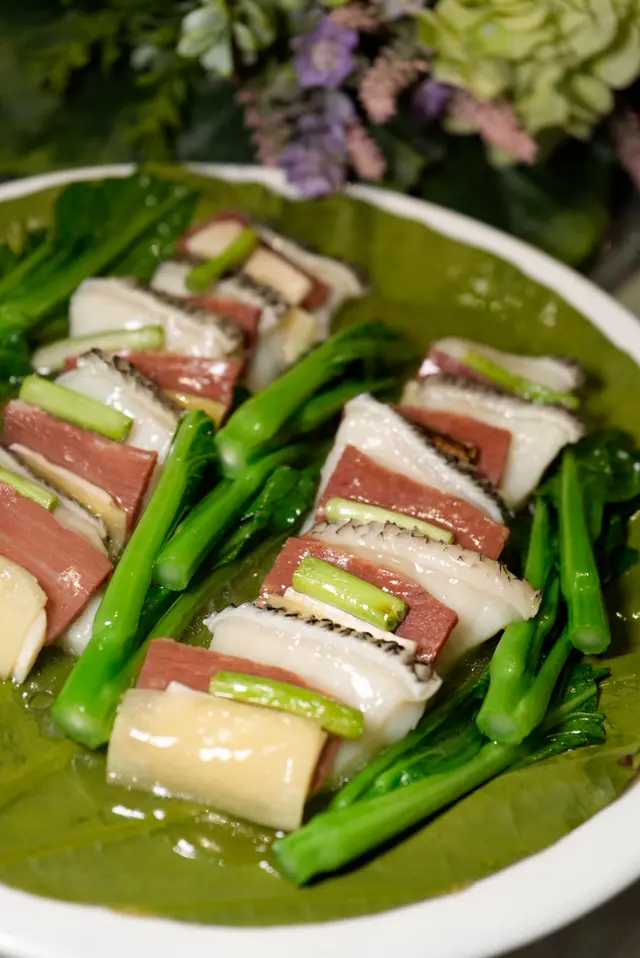 鱸魚 × 金華火腿 ×雞髀菇,蒸製保留荷葉清香,上湯提鮮畫龍點睛。