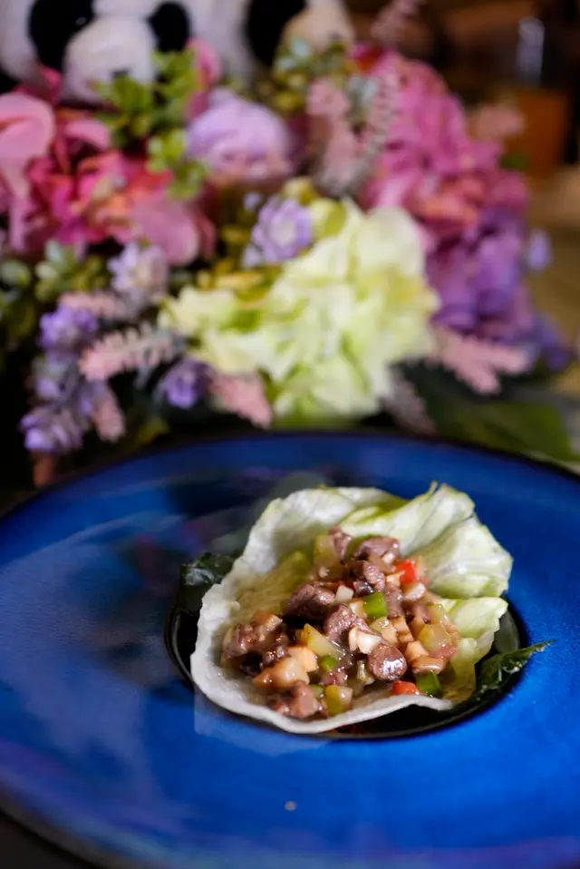A3和牛粒爆炒蓮藕甘筍,脆嫩生菜包裹,脂香爽脆。