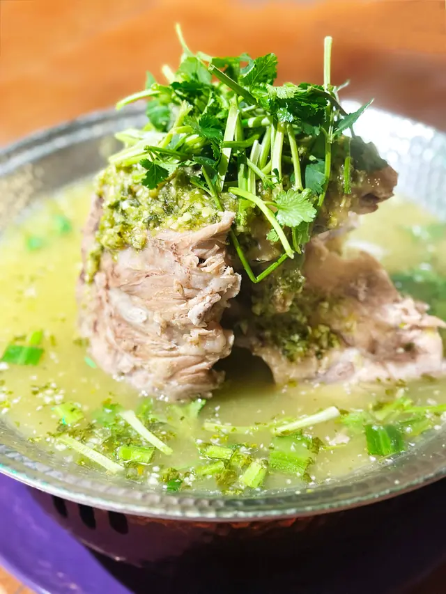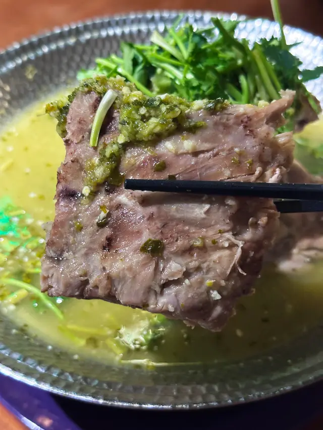 泰式珍寶火山排骨 : 上枱賣相吸睛,用巨型豬脊骨及多種泰國香料醃製和燉煮兩小時,肉質煮到軟淋入味,淋上濃郁秘製酸辣芫茜冬蔭湯汁,體驗一場視覺和味覺的雙重火山爆發,味道少辣,酸辣惹味