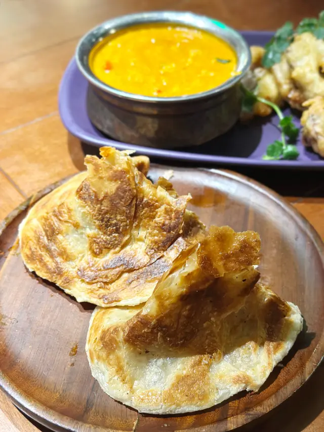 印度薄餅 : 印度薄餅煎得香脆,蘸上滑蛋黃咖喱汁,夠曬惹味