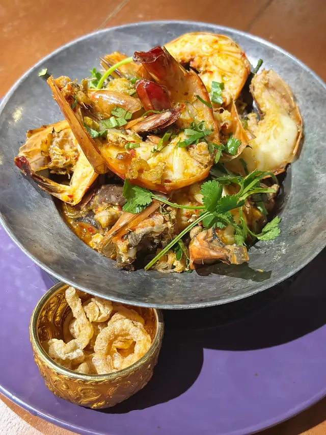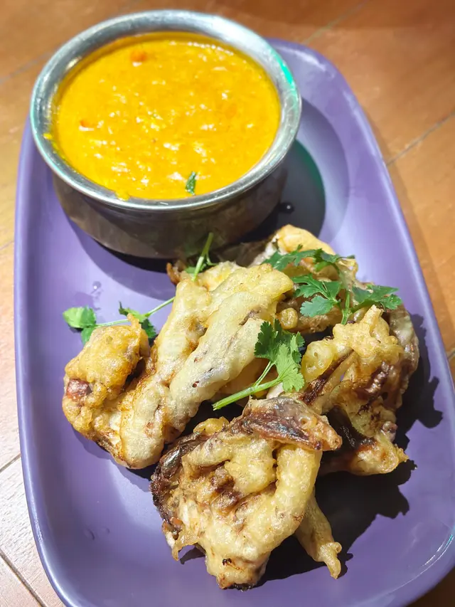 泰式滑蛋黃咖喱軟殼蟹 : 軟殼蟹炸得金黃酥脆,仲啖啖肉,再蘸上結合泰式咖哩濃郁風味、滑蛋香滑口感嘅黃咖喱汁,味道甜甜辣辣,味道層次超豐富