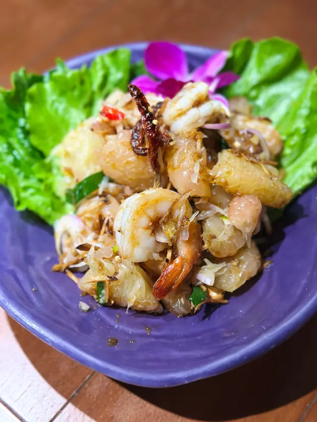 大蝦柚子沙律 : 大蝦夠曬爽口彈牙,加入柚子肉、花生、泰式香料及酸甜醬汁撈埋一齊食,口感清新開胃