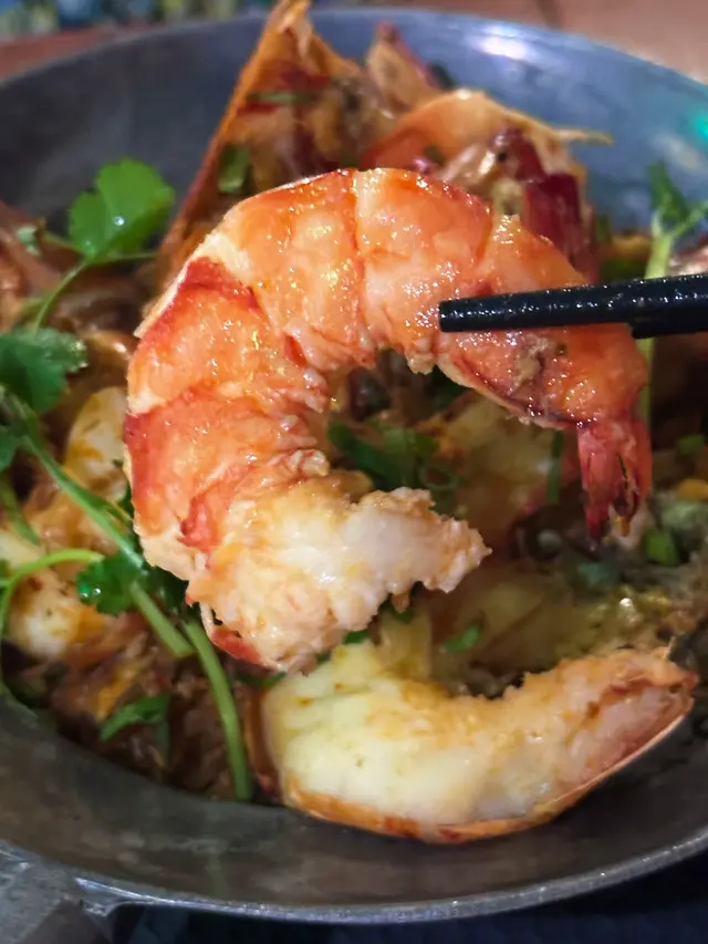 泰式大蝦粉絲煲 : 大蝦開邊焗夠曬入味,口感爽彈,底層嘅粉絲加入多款泰式香料爆炒,吸收了醬汁和香料的精華,味道香濃惹味