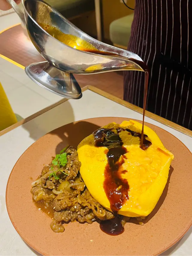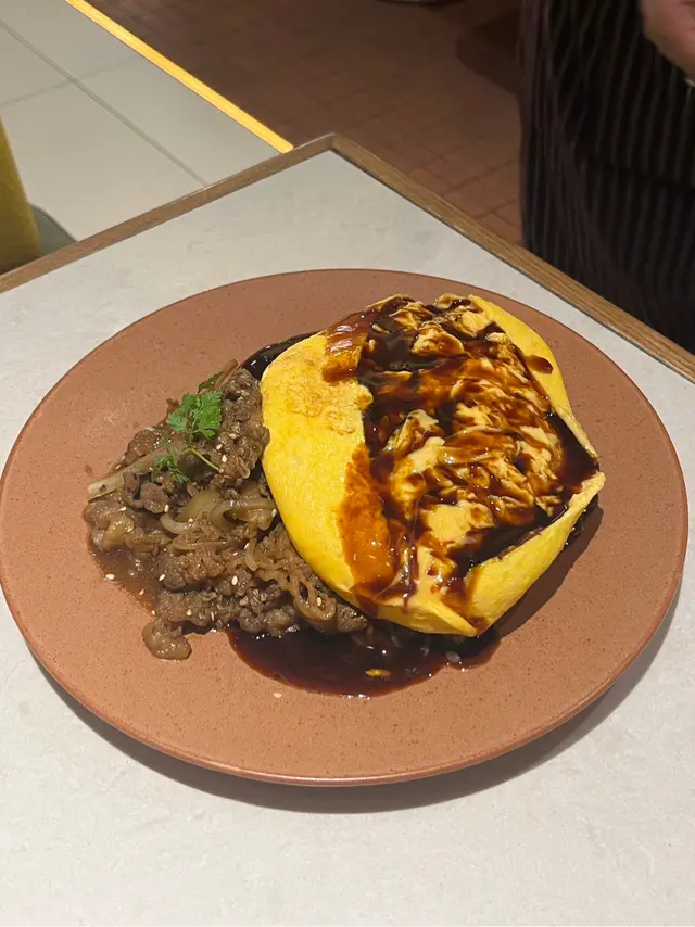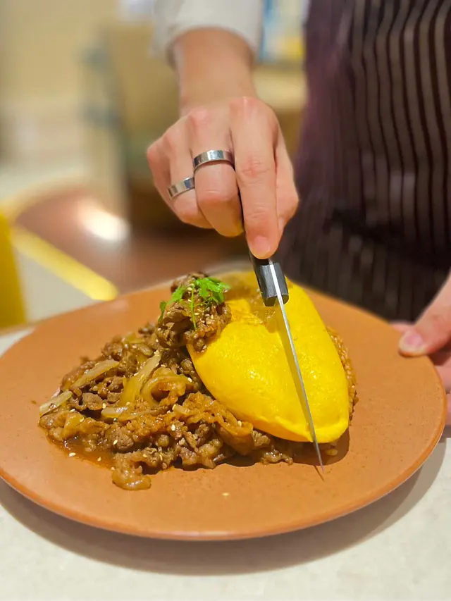 特别推荐!我觉得这个烤牛肉蛋包饭超级好吃!服务员用刀子轻轻一划蛋液就流了下来包裹着烤牛肉炒米饭,真的很香很好吃!