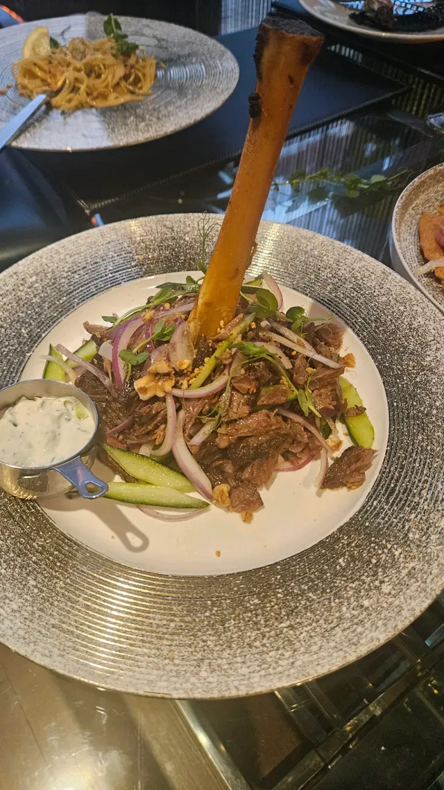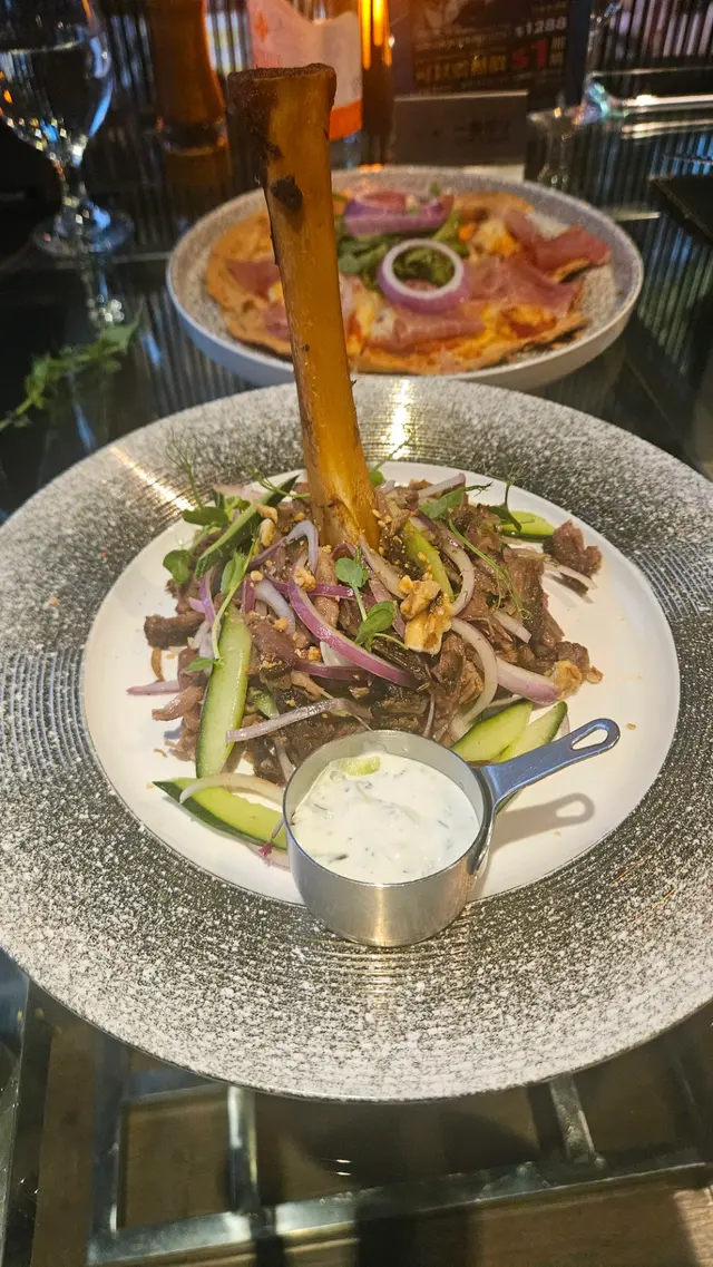 菜品造型很有希臘的儀式感,羊膝肉都已經撕好,中間插了一根羊膝棒,羊膝肉原汁原味帶有燒烤香味,搭配的新鮮黃瓜和洋蔥,為菜肴增添了清新的口感,提升了羊肉的豐富滋味!