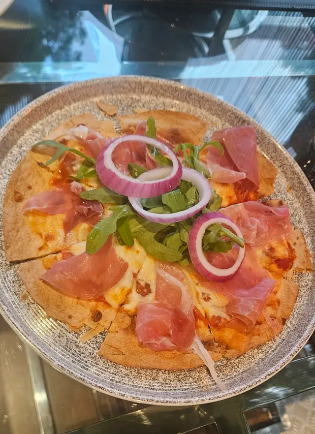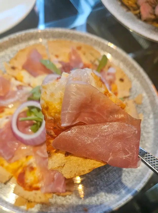 薄餅好薄脆,香氣四溢的芝士融化後拉絲的效果令人垂涎。風乾火腿的鹹香與芝士的奶香相得益彰,帶來了絕妙的味覺享受!
