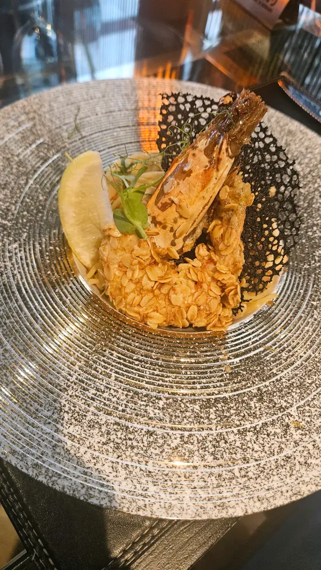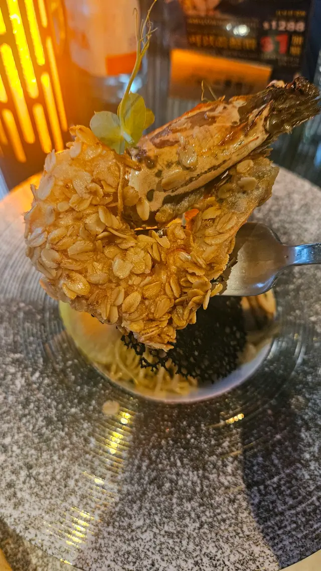 大蝦經過精心處理,外殼已經去除,露出鮮嫩的蝦肉。蝦裹上脆脆的麥皮,麥皮的香脆口感與蝦肉的柔軟形成了絕佳的對比,不僅看起來誘人,口感更是令人難以忘懷,絕對是海鮮愛好者的最愛!