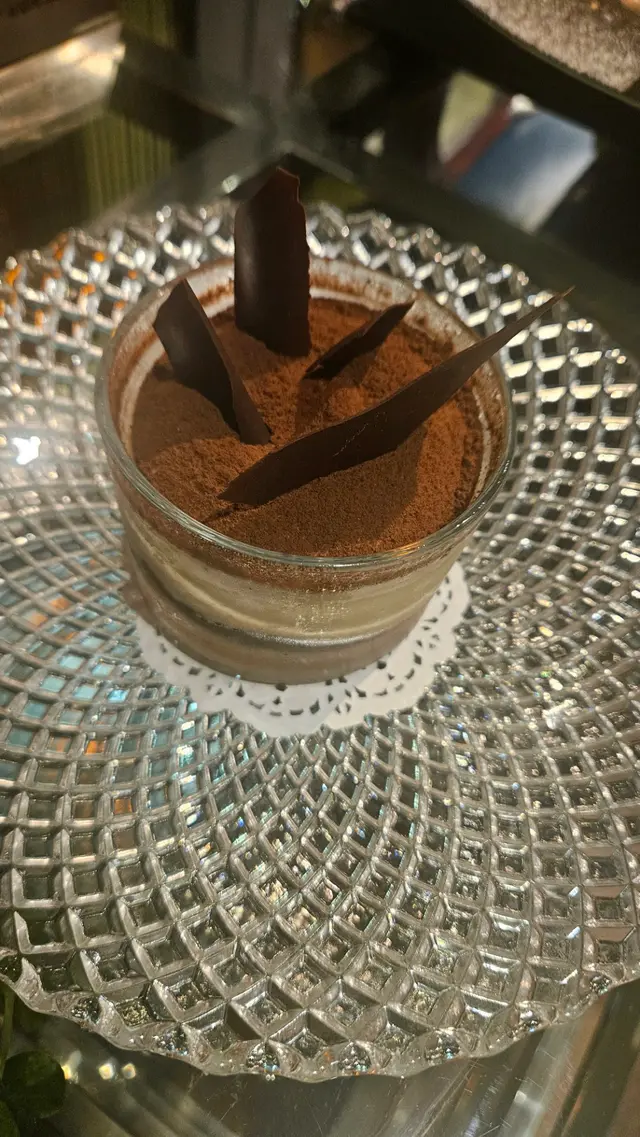 頂部有幾片朱古力,薄餅底部的餅乾層吸收了咖啡的香氣,與芝士層交錯,芝士與咖啡的苦甜完美結合,形成了豐富的口感層次。一放入嘴裡就融化,讓人陶醉!