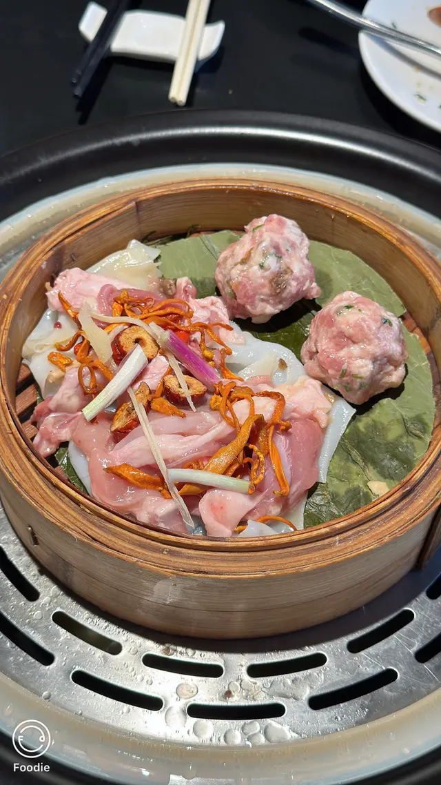 呢個放喺蒸籠入面嘅點心都幾有驚喜,雞肉同豬肉丸都好嫩滑,夾雜住花旗參同蟲草花,食落有陣淡淡嘅藥材清香