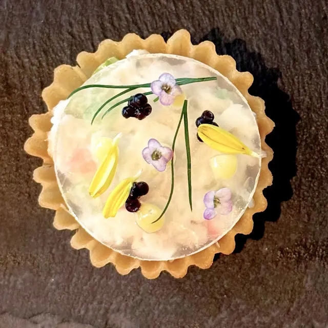 柚子啫喱紫蘇蟹肉脆撻!清脆的撻底內填滿了阿拉斯加蟹肉,面層在再鋪上一層通透的柚子啫喱,一口吃下去非常清新柚子香氣背後帶著紫蘇芳香,配搭鮮甜的阿拉斯加蟹肉美味之處盡在不言中。