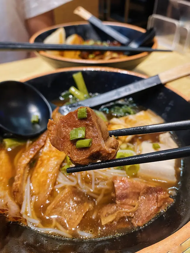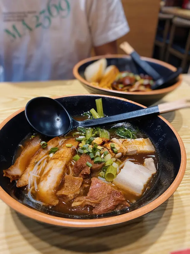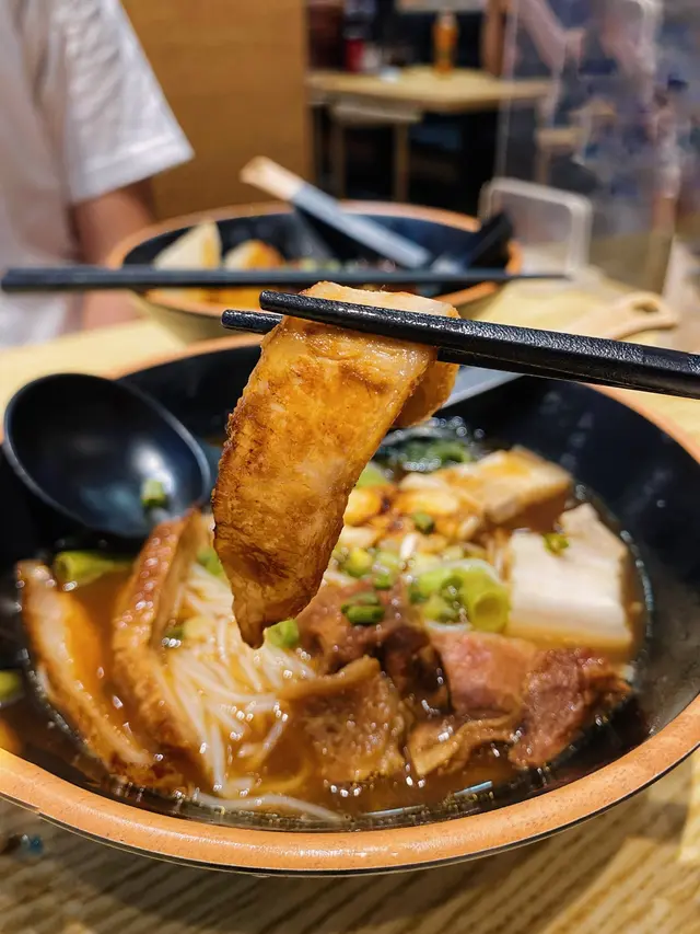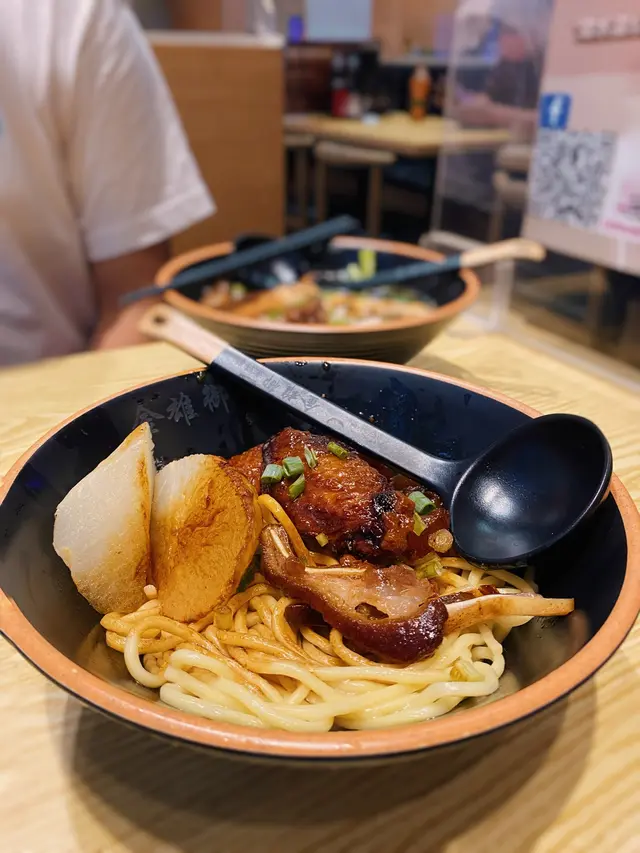 「第二碗選了湯麵,豬骨湯底很淡,味道全靠配菜的滷水汁。滷水汁與辣汁一樣都是金雄御的老師傅獨家秘方,香料味不會搶鏡同時也不是死咸,帶有輕微甜味。但豬頸肉、豬腩肉普普通通,五香牛腩更是柴到變成一枝枝肉絲。要嚐它們的滷水汁,比較建議選牛筋、豬耳、雞翼。」