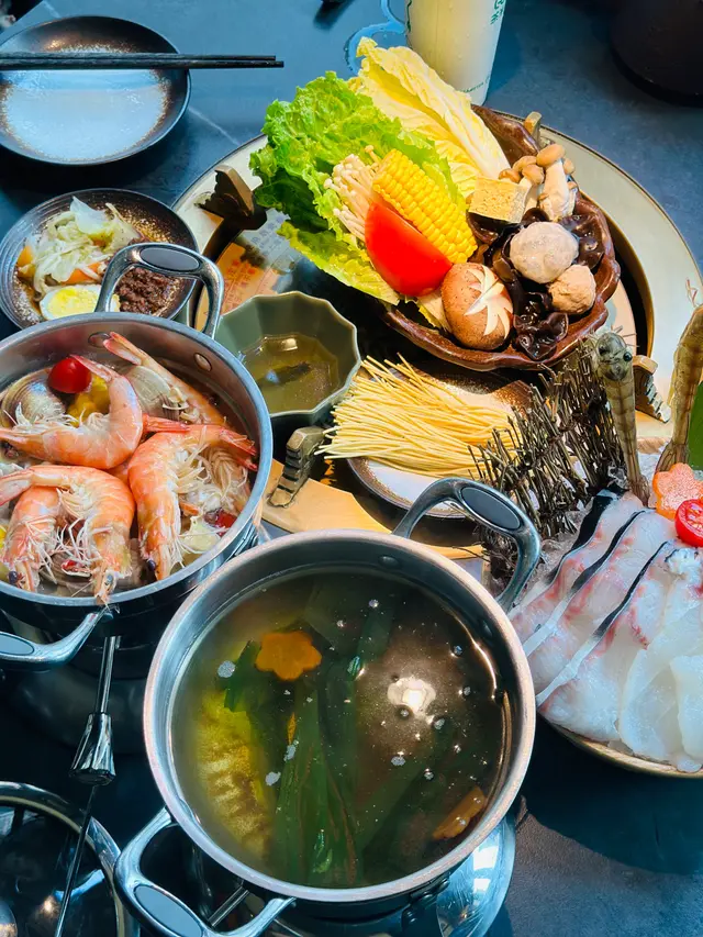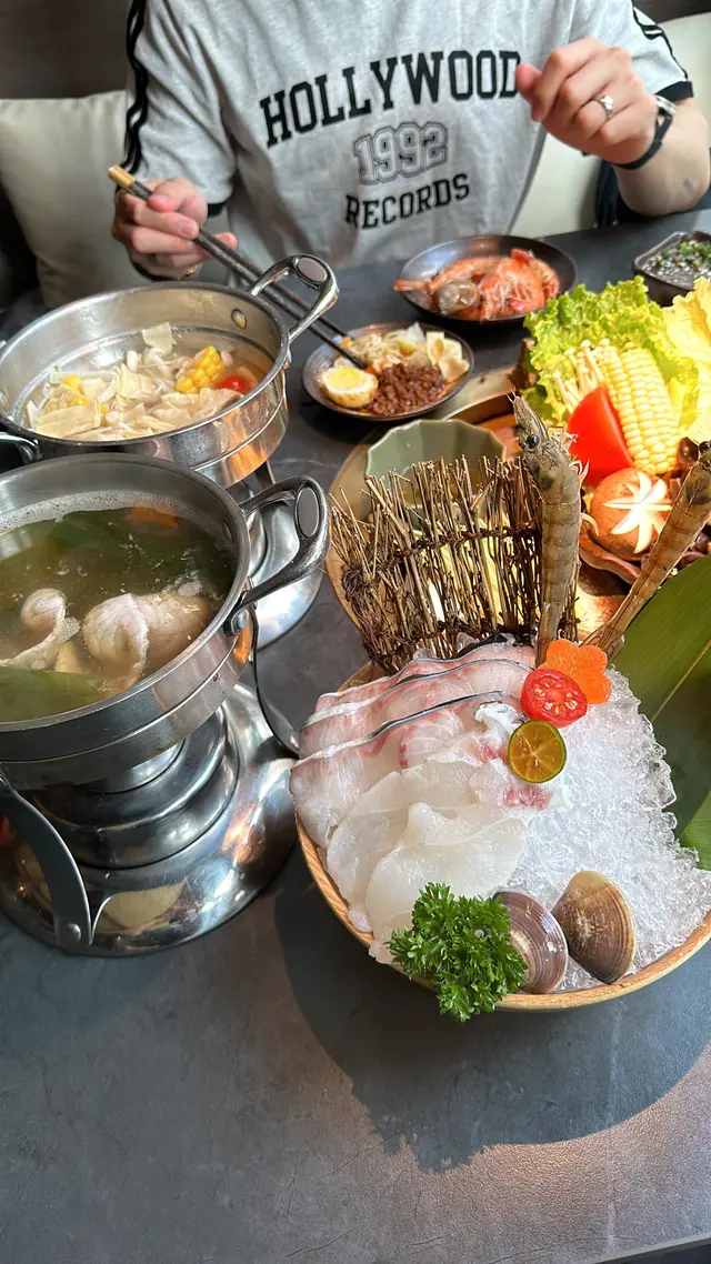 首先必推昆布湯底配活魚海鮮盛合!個盛合賣相勁吸睛,冰船上面鋪滿每日鮮活即劏、手工現切嘅鱲魚片,仲有肥美的海蝦同大蜆,望落就知夠新鮮~ 昆布湯滾起先落蜆,啲湯即刻鮮甜升級!鱲魚片切得超薄,輕淥十零秒就熟,入口嫩滑到唔使咬,滿口都係魚鮮同昆布香;海蝦爽口彈牙,蝦頭仲有膏,正到豎拇指~記住火候要控制好,淥耐咗會韌㗎!