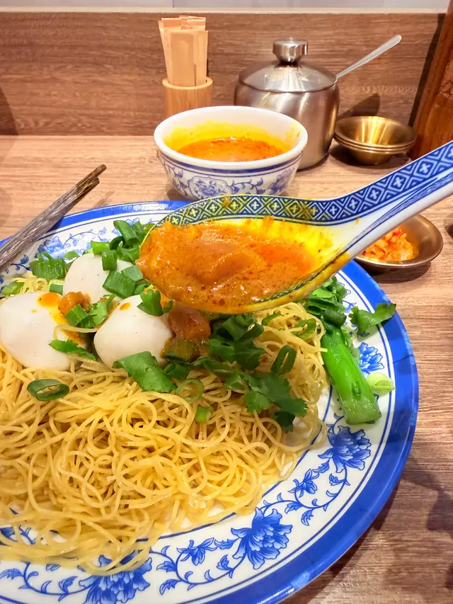 我叫咗火辣紫薯咖哩雙拼撈麵,配埋佢哋日熬至少8小時嘅雞白湯底,真係香濃又滑,重點係可以飲哂,唔會死鹹。麵用永樂老字號,堅持香港製造,口感彈牙,食落有誠意。