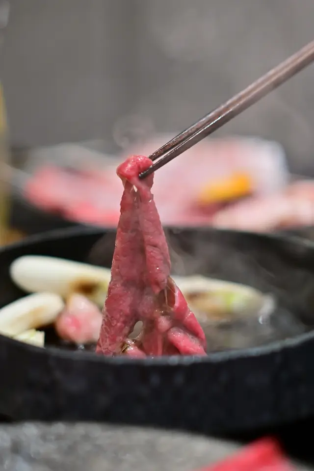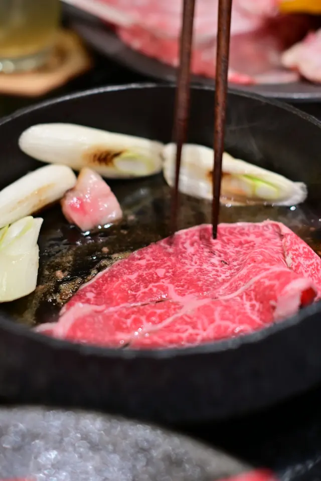 牛脂開鍋輕煎和牛,再加入專用醬油與糖調味,和牛沾上日本生蛋汁入口即融