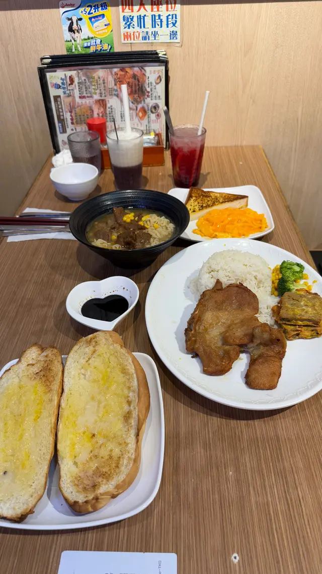 金牌沙爹牛肉即食麵餐則是驚喜。牛肉軟嫩,沙爹醬濃郁,麵條彈牙;嫩滑炒蛋口感絲滑,蛋味香濃,蒜蓉厚多士香脆,蒜味撲鼻。
