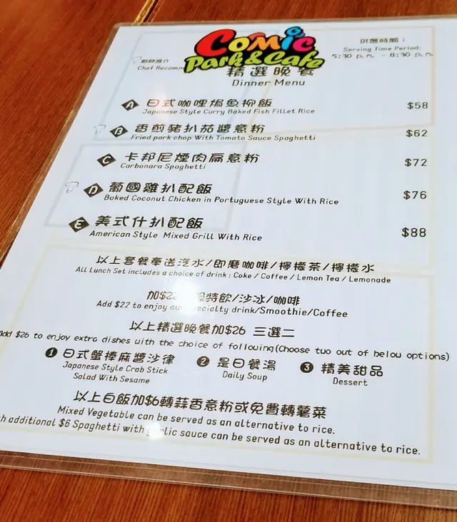 🎈餐廳提供幾款精選晚餐,由$58-$88不等,加$26可額外從沙律、餐湯及甜品三款中選兩款配搭。