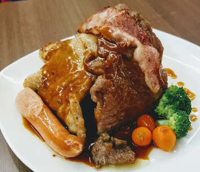 份量夠晒大,疊到一座山,有雞扒、牛扒、豬扒、腸仔、煙肉及配菜,甚為豐富,各款扒類不“鞋”不韌,肉林入味,配上醬汁食味道不錯。