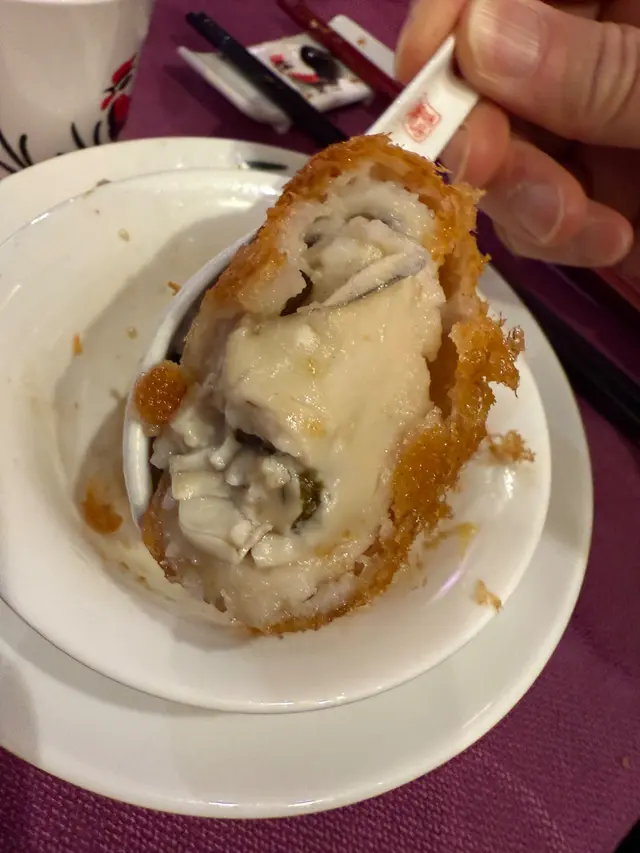 第三道潮式芋茸酥炸生蠔,脆皮包住芋茸再包住隻肥美生蠔,外面酥炸脆口外皮包裏住肥美金蠔,入口散發香濃的芋頭香氣,加上酸甜醬~夠哂開胃