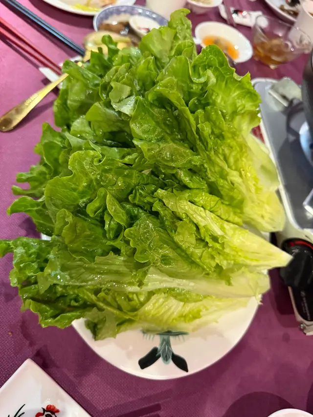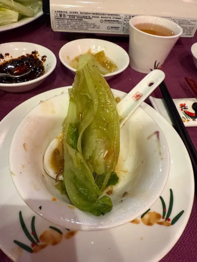 第七道羊汁自煮唐生菜,就係大大份唐生菜在已食得七七八八嘅羊腩煲內,用爽脆嘅唐生菜浸到濃郁湯底內,將剛才入口肥美嘅口感清新一下,同樣唐生菜份量十足,夠晒新鮮