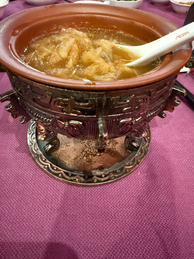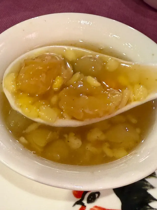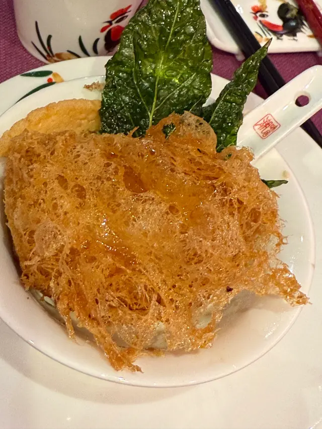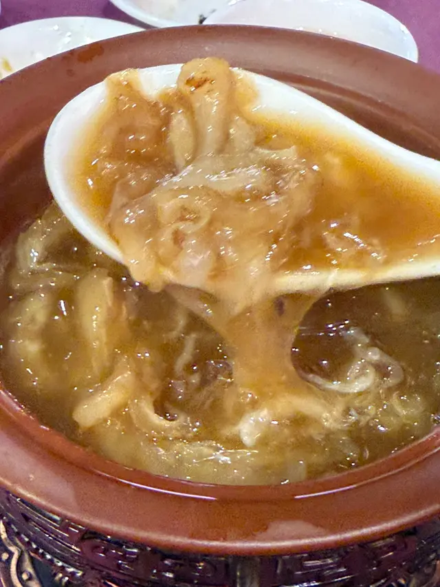 第四道潮州紅燒花膠魚翅,上枱嘅食具已經贏了,盛滿了黏稠濃厚的花膠魚翅翅,湯翅入口柔軟味豐厚,非常軟滑,充滿骨膠原嘅口感,雖有芫荽可加,但原味入口已經足夠,加上材料十足,真係讓人十分回味