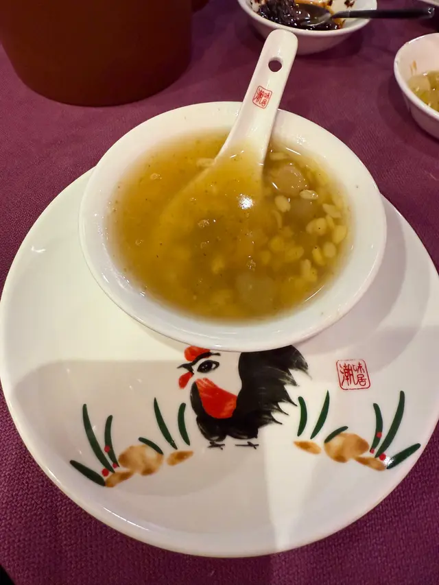第九道潮州福果綠豆爽,以冰糖水及馬蹄粉勾芡,簡單以開邊綠豆拌煮,味道淡身,微甜且較黏口稠身,充滿粒粒綠豆,口感清新